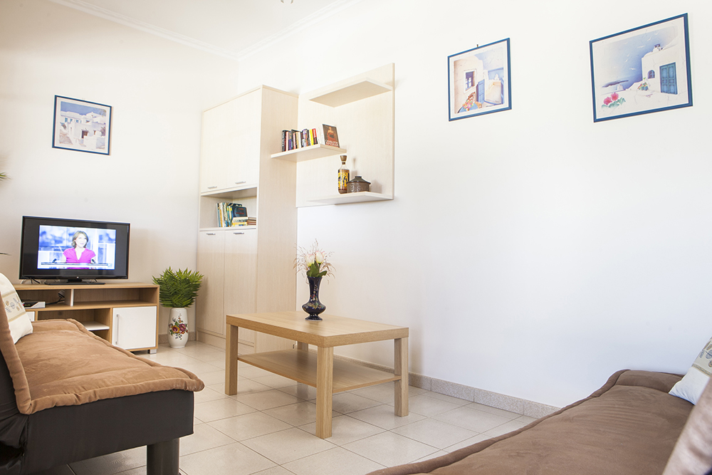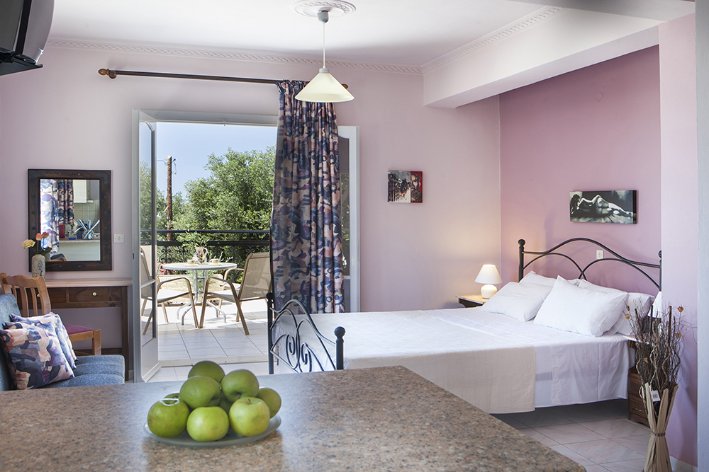 Polymnia I has the top floor apartment with two bedrooms and the ground floor studios.